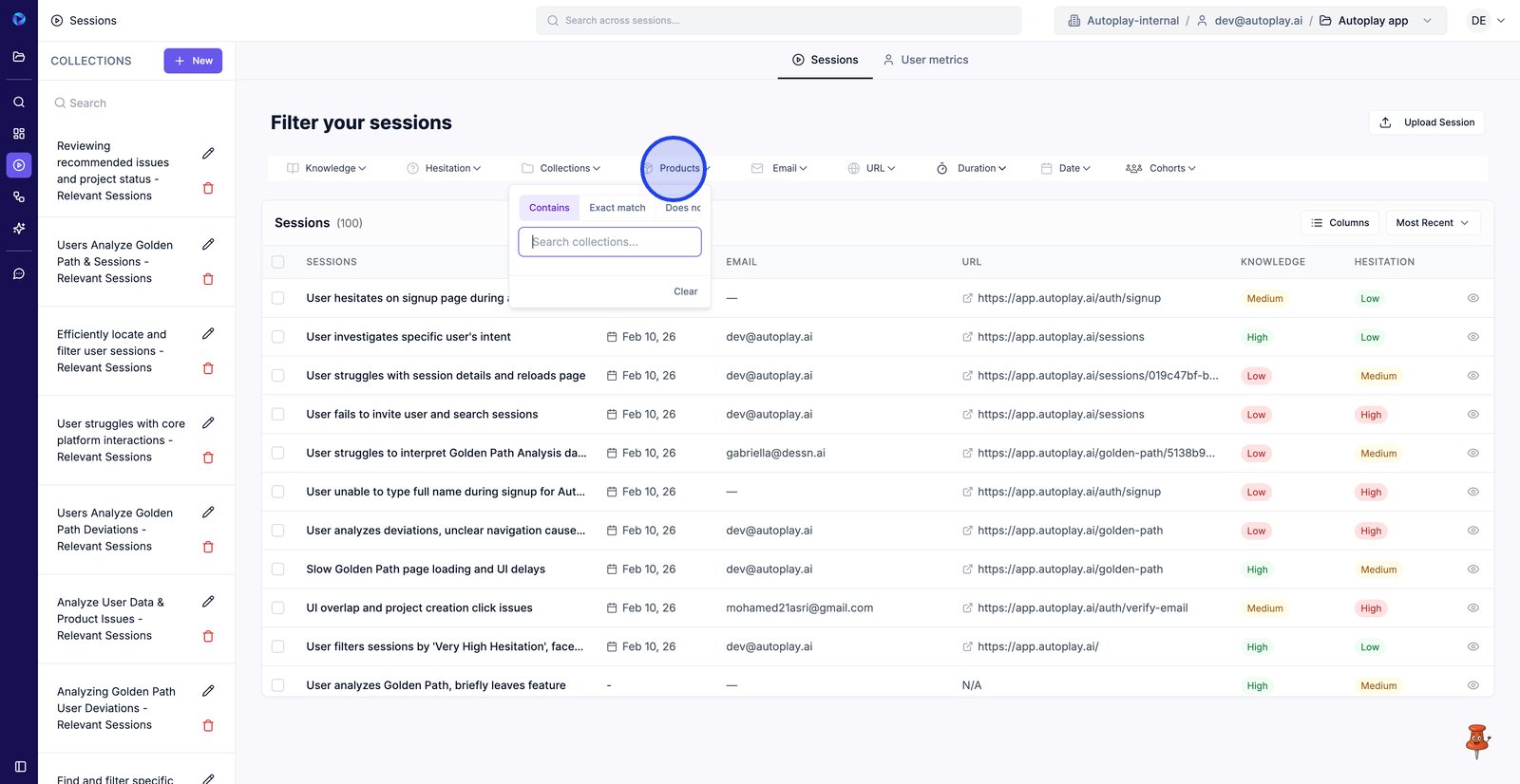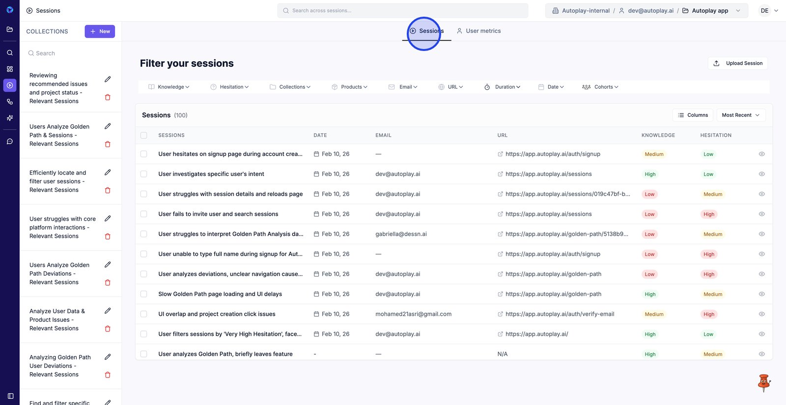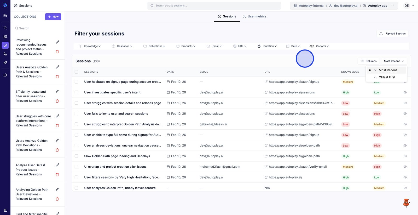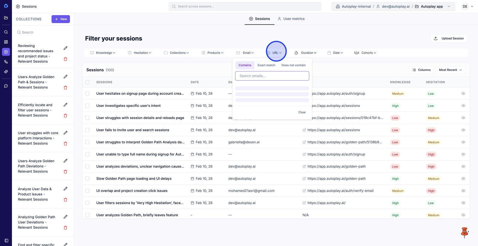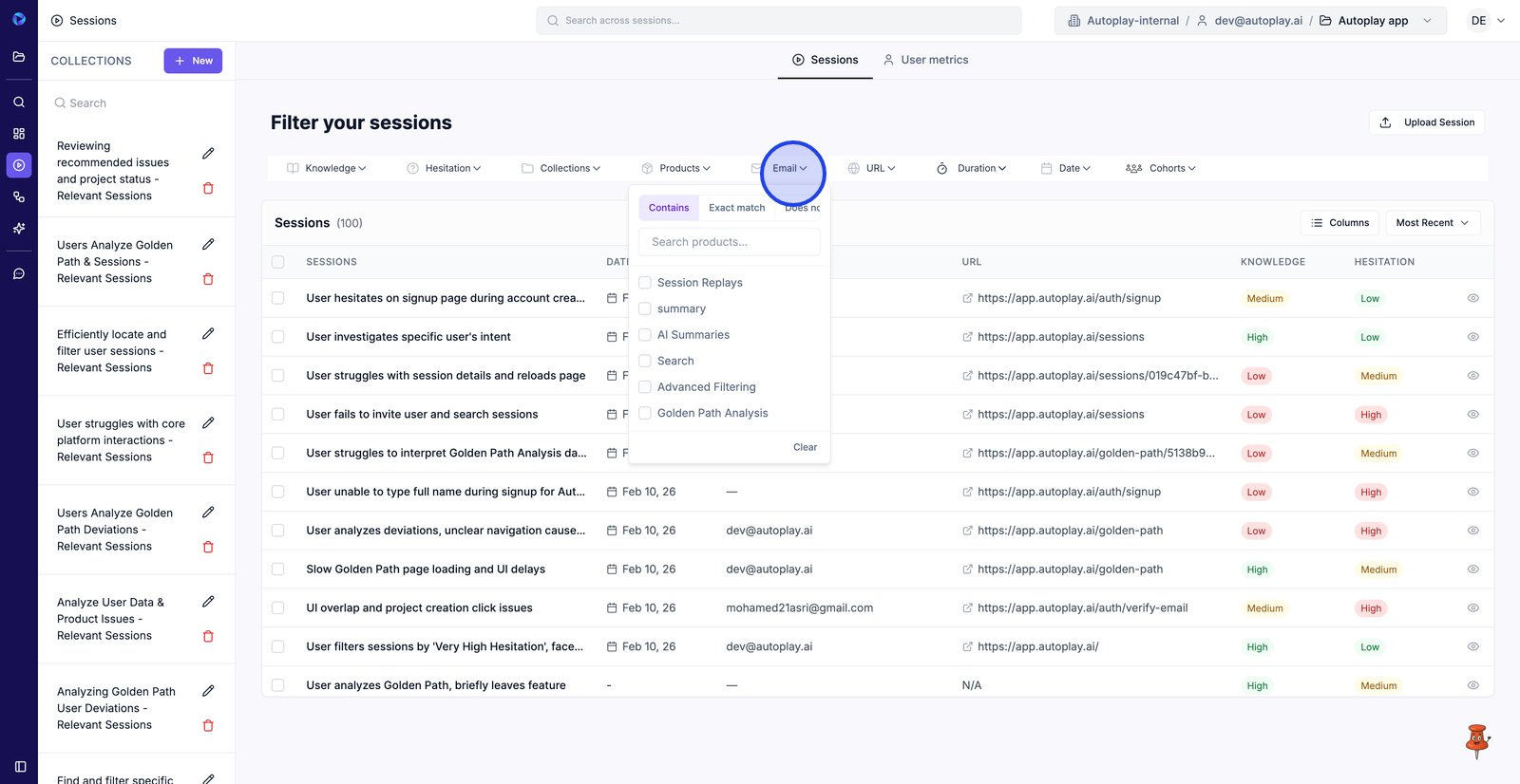 9. Filter by Email to find sessions from a specific user.
