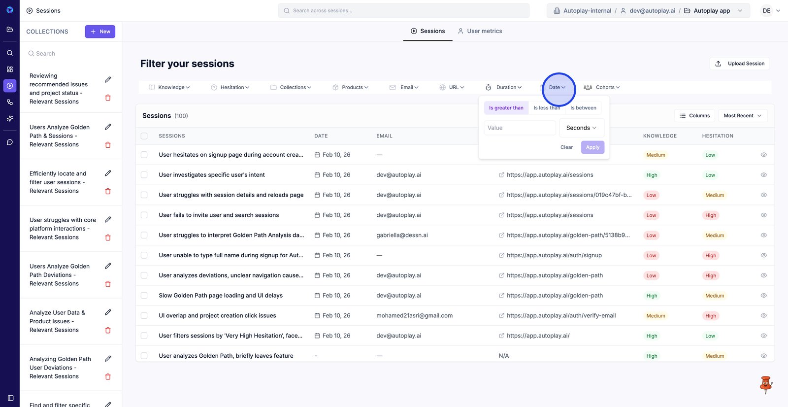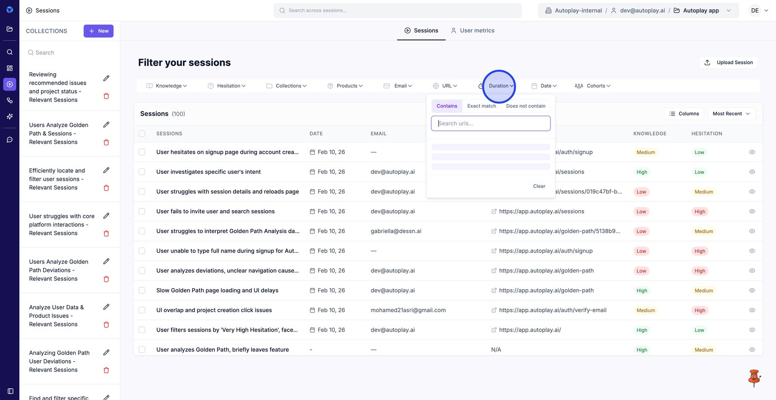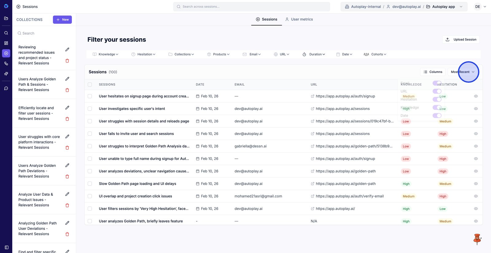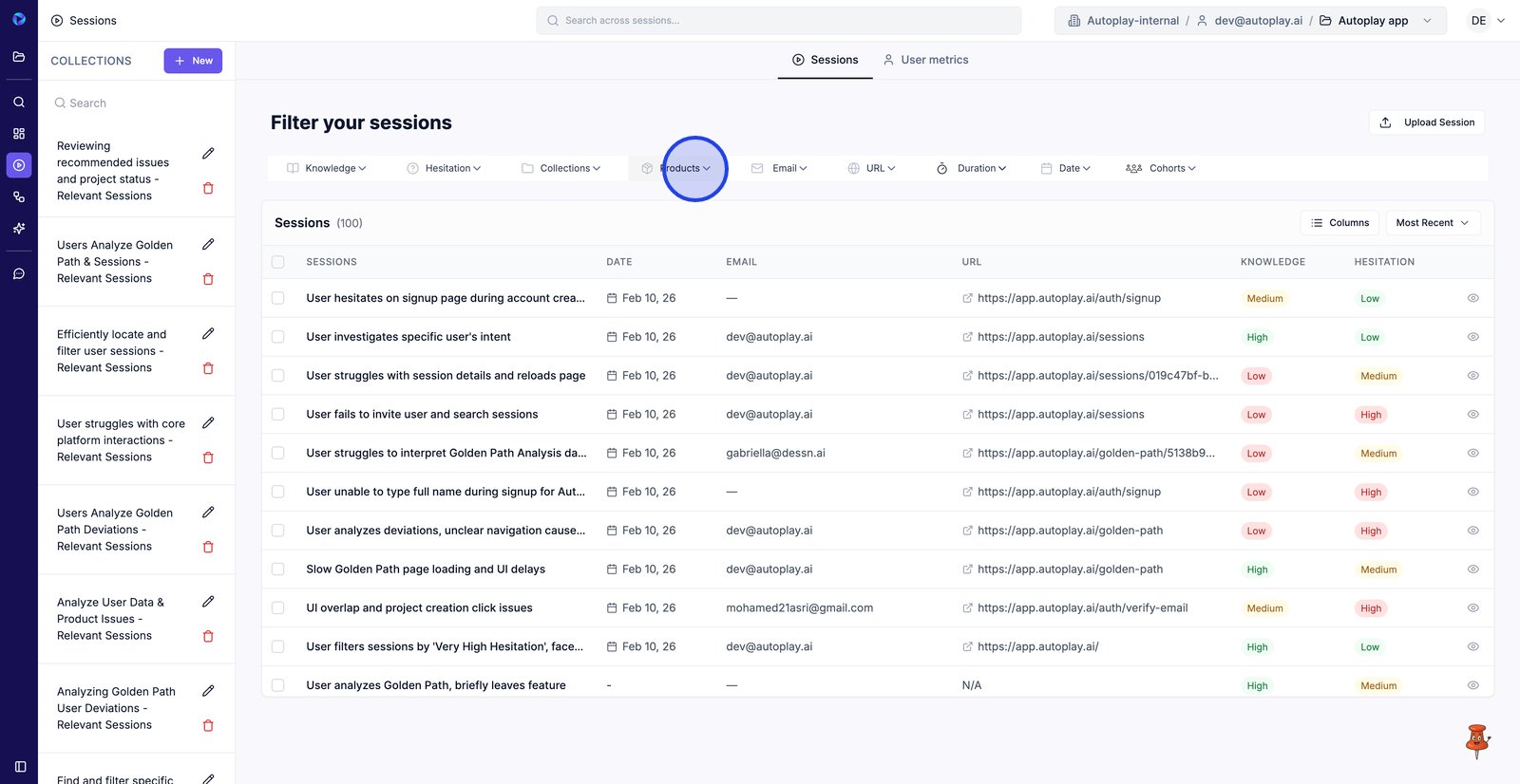 9. Filter by Email to find sessions from a specific user.
