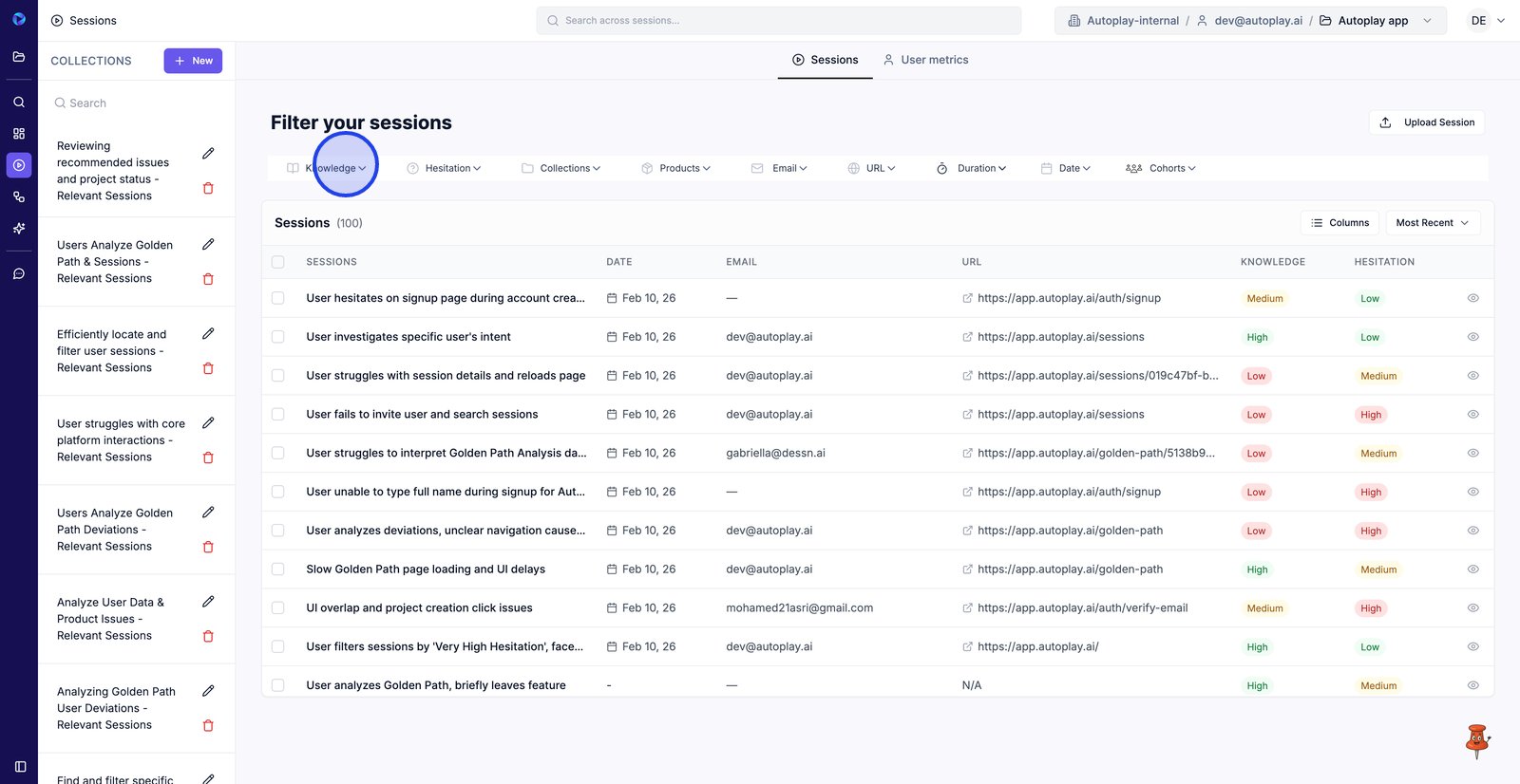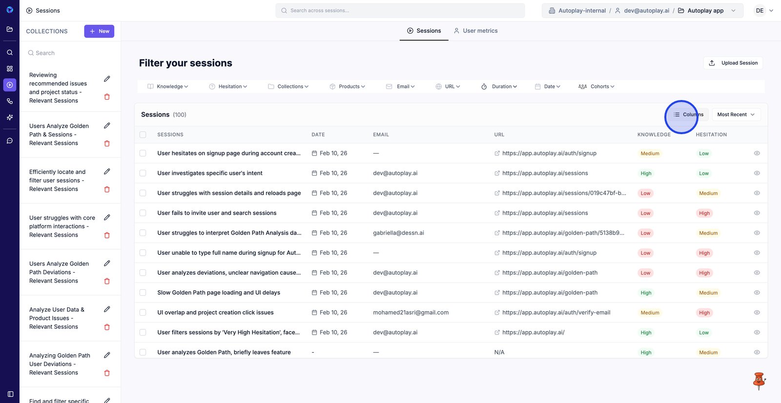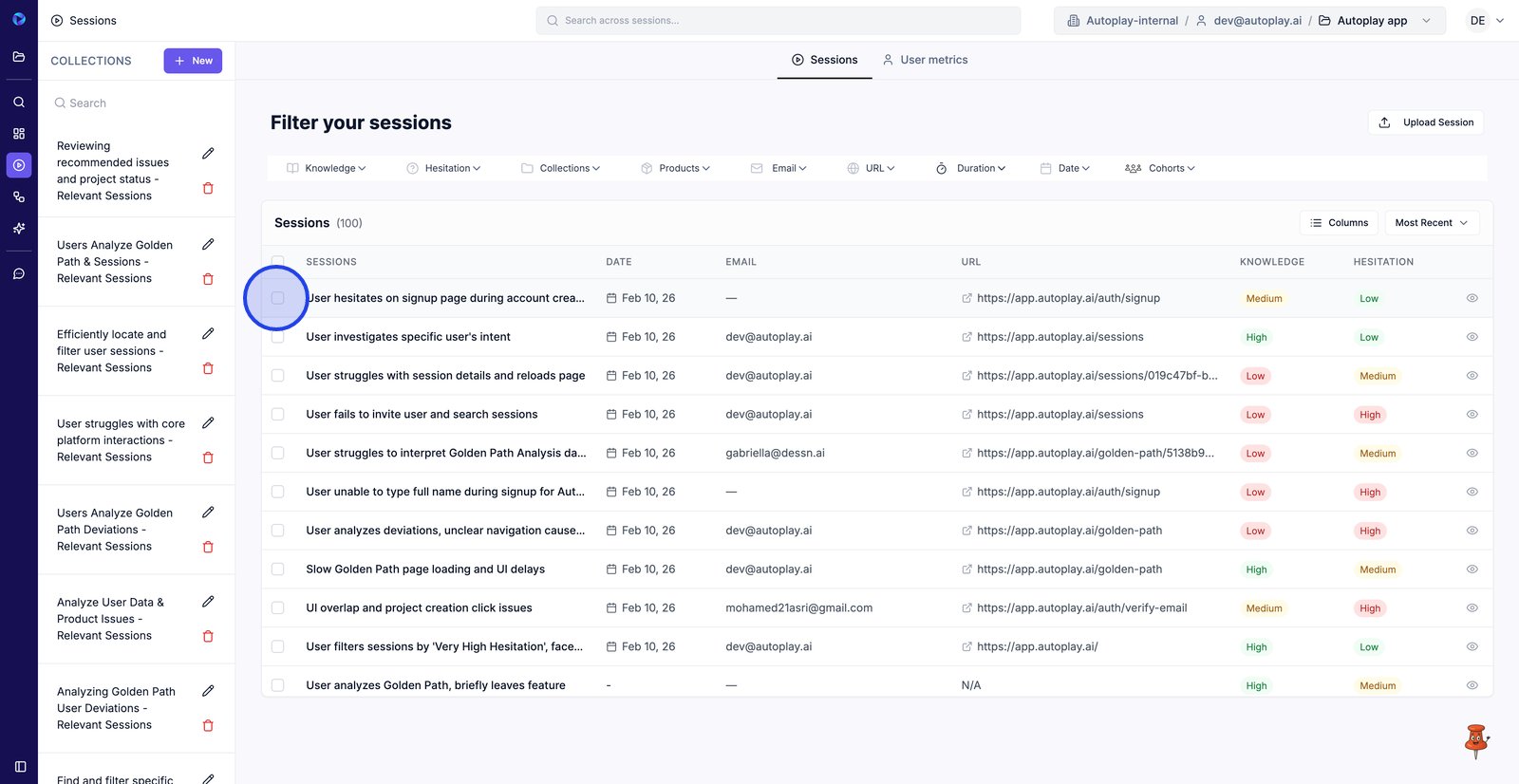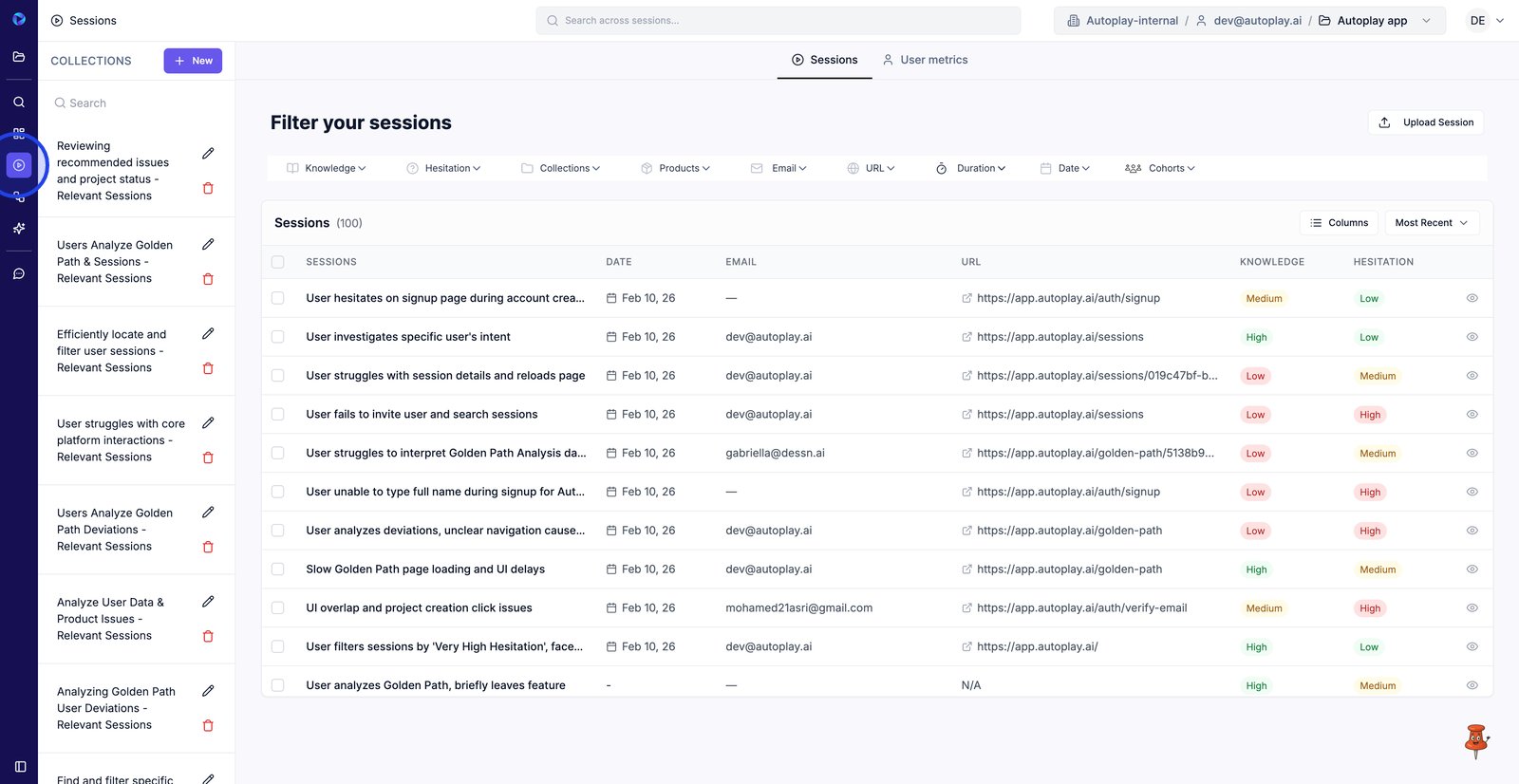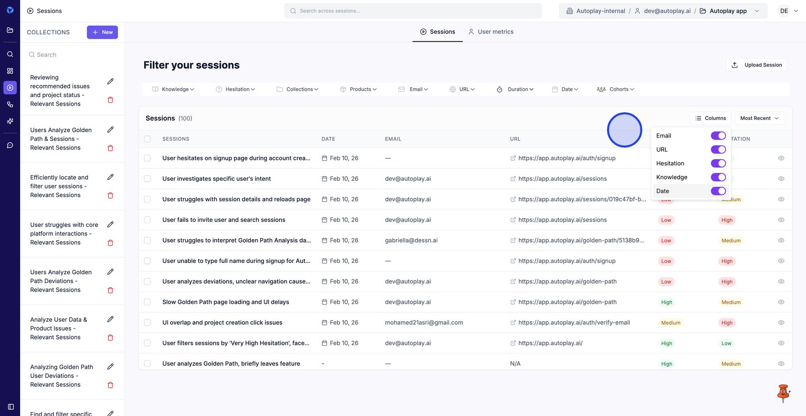 9. Filter by Email to find sessions from a specific user.