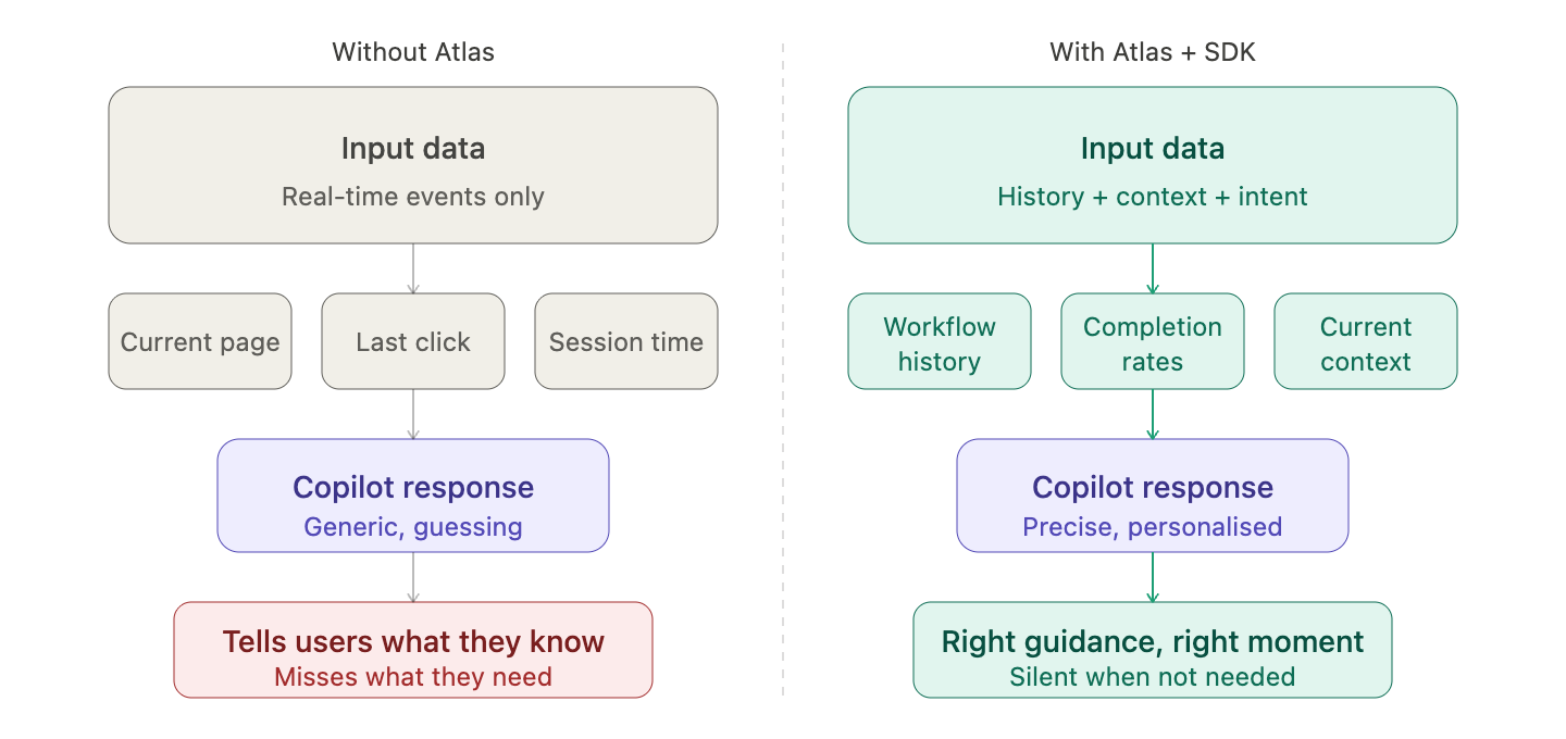 This is why real-time events alone aren't enough. Events tell your copilot what a user is doing right now — but without the history of what they've already mastered, your copilot risks suggesting something they've long since figured out. Atlas gives it the full picture: not just the present moment, but everything that came before it.