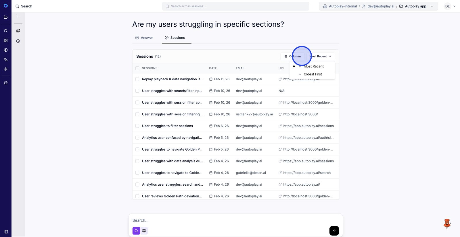 6. Filtrez par adresse e-mail pour afficher les sessions d'un utilisateur spécifique que vous souhaitez examiner.