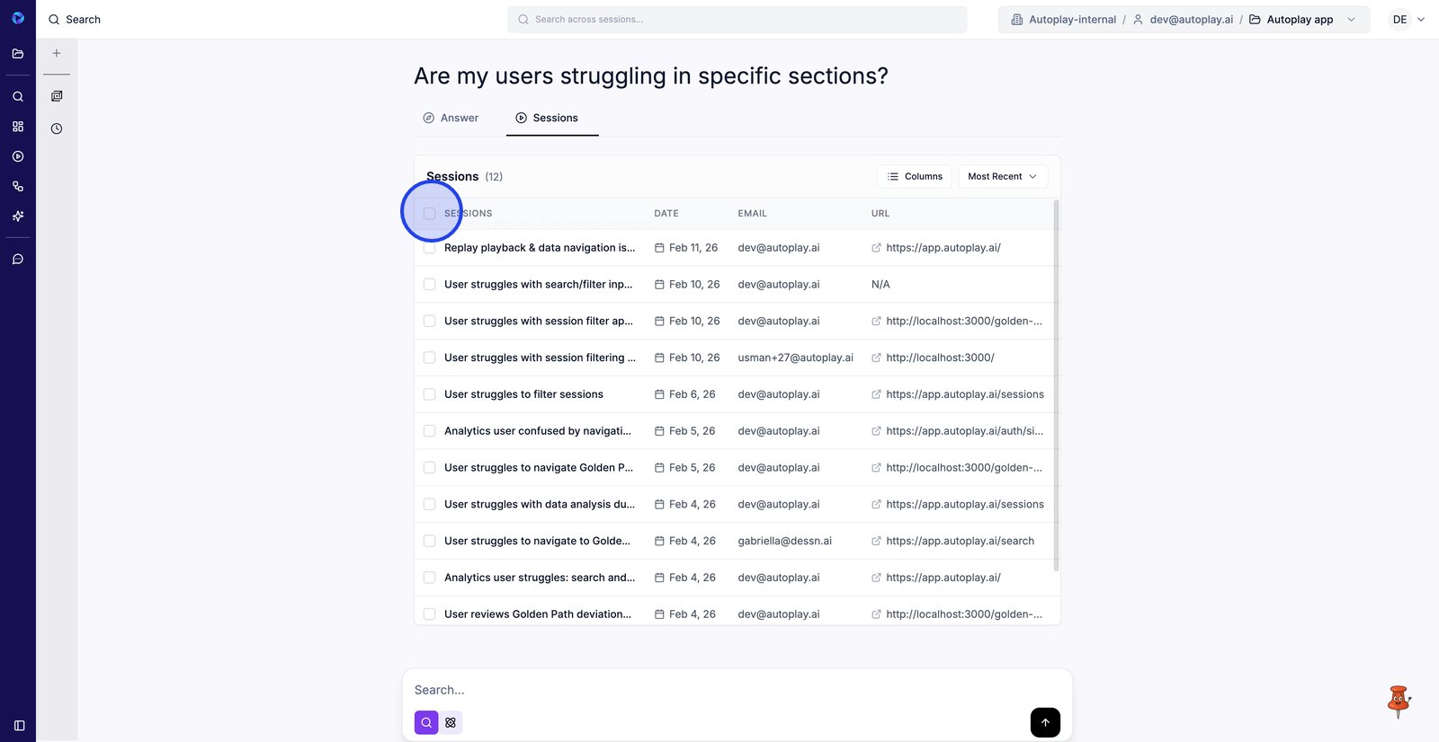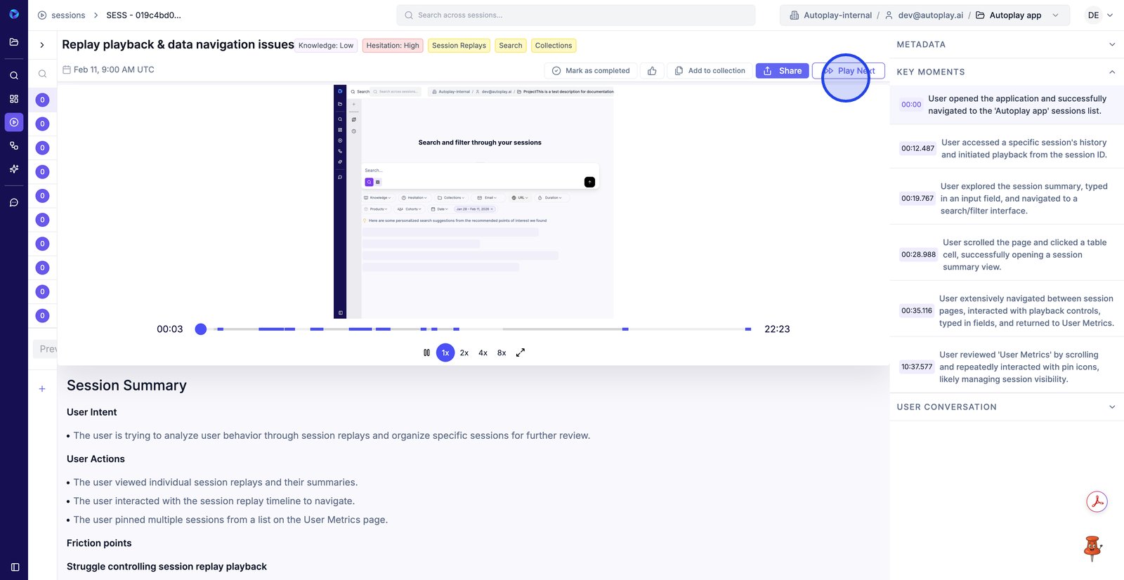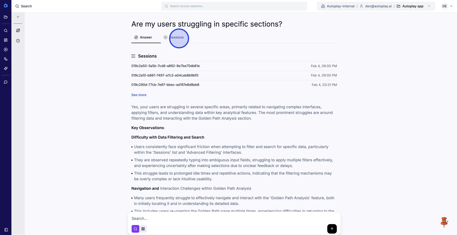 15. Passez à l'onglet Sessions pour revoir les rediffusions exactes qui ont permis d'obtenir la réponse.