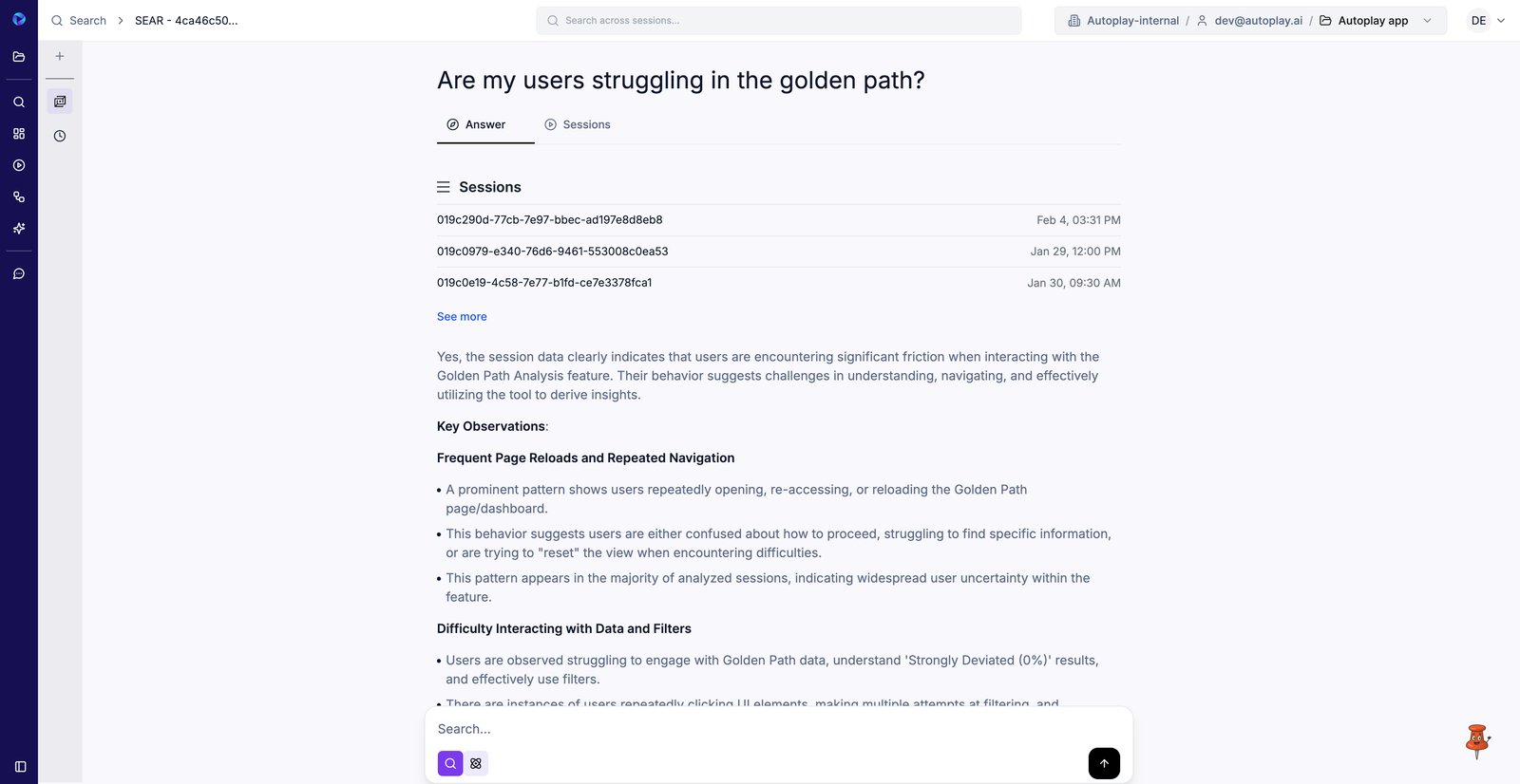 23. Cliquez sur une requête suggérée pour visualiser instantanément les modèles de friction agrégés sur l'ensemble des sessions.